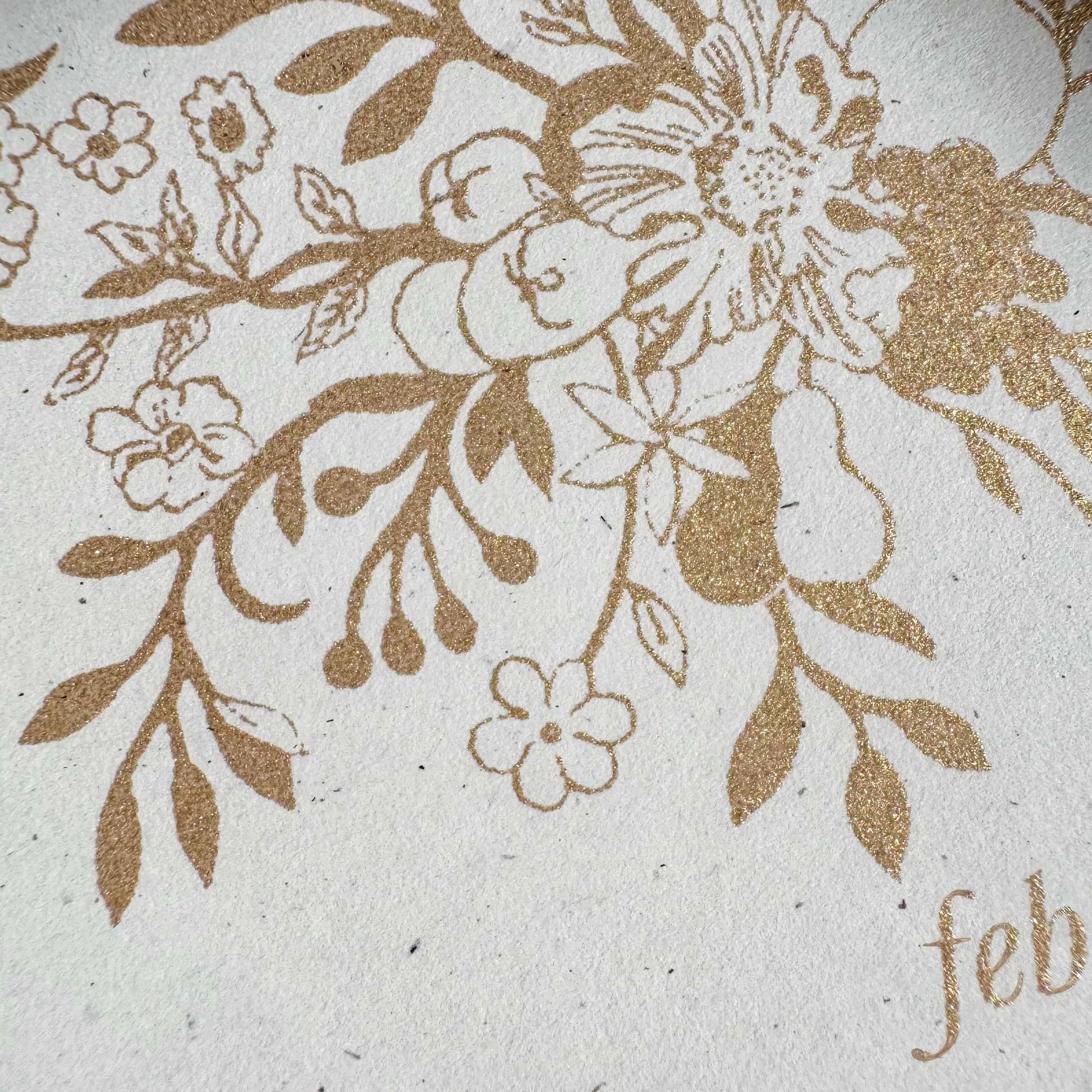 - Screen printed in metallic gold ink on a neutral paper with natural inclusions as a nod to the parchment papers of the original reference images.